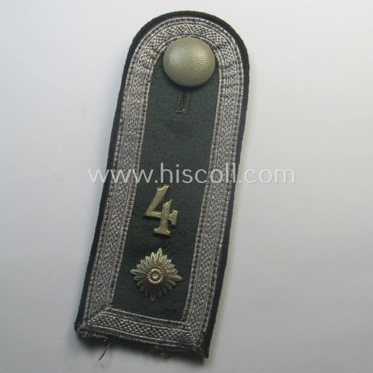 This is a neat - albeit regrettably single but nevertheless not that often seen! - (I deem) early- (ie. mid-war-) period, so-called: 'M40'-pattern, 'cyphered' WH (Heeres) NCO-type shoulderstrap as was piped in the desirable black- (ie. 'schwarzer'-) coloured branchcolour as was specifically intended for usage by a: 'Feldwebel u. Mitglied des Pionier-Bataillons 4' (or: NCO and sergeant who served within within the army-engineers battalion, numbered: '4') and that comes in an overall nice- (albeit moderately used- ie. just moderately worn-), condition. The shoulderstrap - which measures approximately 12 cms. in length as more often seen - has the neat black-coloured- and/or woolen-type piping attached (as is more encountered with these early war-period shoulderstraps). The shoulderstrap - which originates from a larger cloth- and insignia-collection I recently acquired for the web-site - shows the silverish-grey-toned (ie. non-sub-dued, dotted- ie. early-pattern) NCO-braid attached and comes without tongue: next to this it shows a neat (older-styled, smaller-sized and/or: 'Buntmetall'-based) '4'-cypher (ie. 'Ziffer') and a single (equally styled and/or smaller-sized) pip period-attached (as can be noticed on the pictures). Of additional interest is, moreover, the fact that this strap once showed an embroidered '4'-cypher (which was period-removed by regulation). The strap - that is in my opinion a typical 'standard-issued' example shows some evident age, wear and/or staining and came with a field-grey tunic-button attached (as can be noticed on the pictures). Simply an attractive WH (Heeres) so-called: 'M40'-pattern, NCO-type 'Pioniere'-related shoulderstrap that was intended for usage by a: 'Feldwebel u. Mitglied des Pionier-Bataillons 4': too bad that it is only a single specimen!