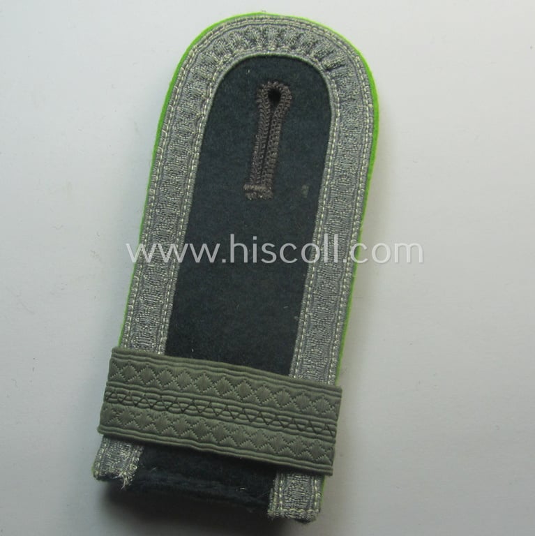 This is a neat - albeit single but nevertheless fairly scarcely encountered! - WH (Heeres) I deem) mid-war period- (ie. 'M43'-pattern- and/or typically tailor-made!) NCO-type-shoulderstrap as was piped in the desirable bright-green- (ie. 'wiesengrüner'-) coloured branchcolour as was specifically intended for - and most certainly worn by! - an: 'Unteroffizier u. Offiziersanwärter der Panzer-Grenadier-Truppen' (ie. junior-sergeant and officers'-candidate who served within an infantry-related, so-called: rifle-regiment ie. unit) and that comes in an overall nice- (albeit moderately used- ie. worn-), condition. The neat shoulderstrap - which measures approximately 10 cms. sized in length - has the darker-green-coloured- and/or (boiled) woolen-based 'upperdeck' and has the neat (and desirable!) bright-green- (ie. 'wiesengrüner'-) coloured- and/or woolen-type, piping, attached. The strap comes naturally mounted on its functional (peculiar-shaped!) tongue and does show obvious wear, usage and/or minimal age. The strap has the 'standard'-type, bluish-grey-coloured (ie. 'sub-dued'-type) 'Heeres'-NCO-braid attached and also shows a double loop (ie. 'Lasche') constructed from bluish-grey-toned NCO-braid period-attached denoting that the bearer held the rank of an: 'Unteroffizier u. Offiziersanwärter' (ie. junior-sergeant and officers'-candidate). Simply an attractive - and actually scarcely found! - NCO-type 'Panzergrenadiere'-shoulderstrap that belonged to an: 'Unteroffizier u. Offiziersanwärter der Panzer-Grenadier-Truppen': too bad that it is only a single specimen!