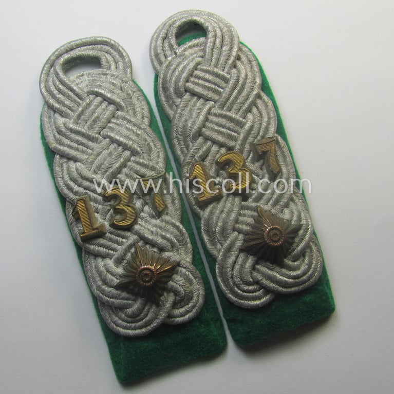 Pair of WH (Heeres) neatly 'cyphered', officers'-type shoulderboards as piped in the darker-green-coloured branchcolour as was intended for usage by an: 'Oberstleutnant des Gebirgsjäger Rgts. 137'
