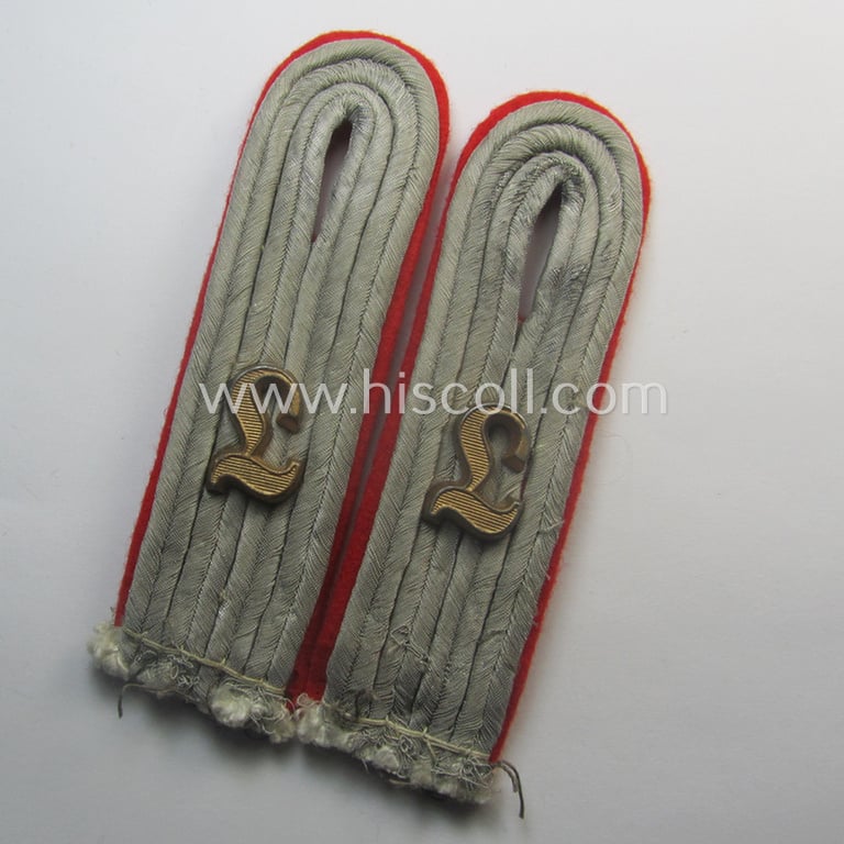 This is an attractive - fully matching and/or with certainty scarcely encountered! - pair of WH (Heeres), neatly 'cyphered' officers'-type shoulderboards (showing a pair of rarely observed, regular-sized- and bright-golden-toned so-called: 'L'-cyphers attached!) as executed in the bright-red- (ie. 'hochroter'-) coloured branchcolour as was specifically intended for a: 'Leutnant eines (Sturm)Artillerie-Lehr-Abteilungs o. Regiments' (or: lieutnant and presumably instructor who served within an artillery-related, schooling-regiment ie. unit) and that comes in an overall very nice- (I deem clearly issued- and/or moderately used- ie. worn-), condition. The attractive boards - which are executed in the typical, 'smooth'-like- (and/or bright-red-coloured) wool (aka 'moleskin'-wool) - measure approximately 10,7 cms. in length each and have silver-greyish-coloured- (ie. truly somewhat sub-dued-) 'upperdecks': I deem that as such they were intended for usage on a 'regular front-used' tunic. The boards never had any tongues attached and were most certainly intended (and worn!) as a pair of the 'sew-in'-pattern (as can be seen on the pictures). Both boards show a pair of (scarcely seen, larger- ie. regular-sized, matching and neatly bright-golden-toned- and I deem 'Buntmetall'-based) so-called: 'L'-cyphers (ie. 'Ziffern') period-attached: both devices are just minimally tarnished and/or stained but are still nice and/or pronounced (as can be seen on the pictures). This particular pair originated from a larger cloth- ie. shoulderstrap-collection I recently acquired for the web-site. Simply a very attractive - and truly scarcely seen! - officers'-type, 'cyphered' shoulderboard-pair that belonged to a: 'Leutnant eines (Sturm)Artillerie-Lehr-Abteilungs'!