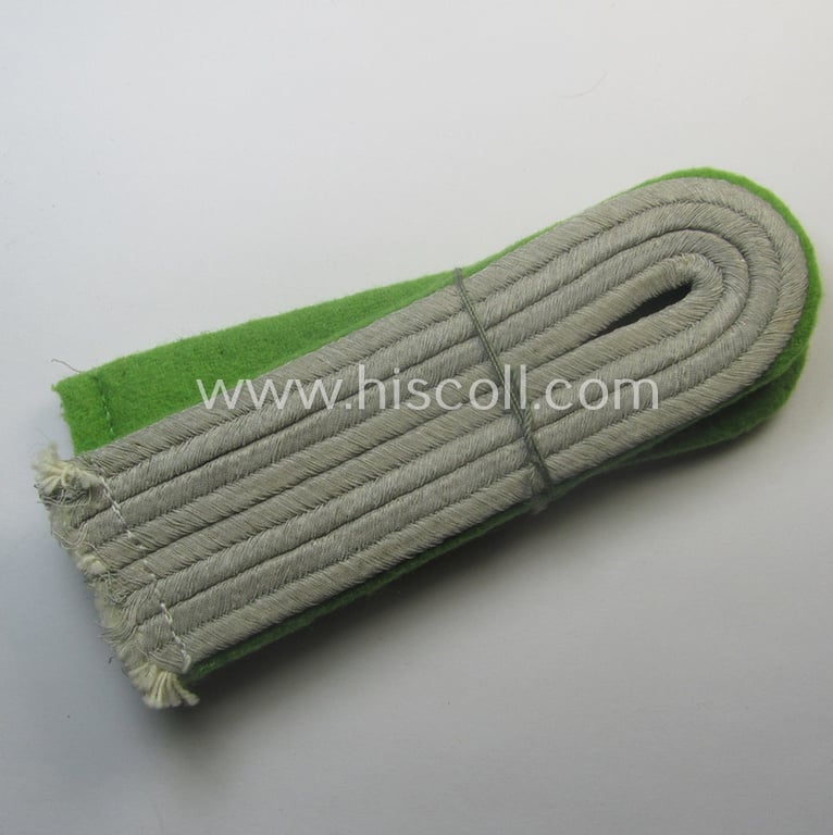 The attractive - and with certainty unusually seen! - pair of WH (Heeres), officers'-type shoulderboards is neatly piped in the typical bright-green- (ie. 'hellgrüner'-) coloured branchcolour and that was as such intended for usage by a junior-officer holding the rank of a: 'Leutnant der Panzer-Grenadier-Truppen' (or: lieutnant who served within a within a later-war-period, infantry-related so-called: rifle-regiment) and that comes in an overall very nice- (I deem simply never used- nor worn- ie. still 'virtually mint- ie. issued'-), condition. The boards have the (somewhat sub-dued) silverish-grey-coloured 'upperdecks' (as can be noticed on the pictures). The boards show the desirable bright-green- (ie. 'hellgrüner'-) coloured branchcolour (and were constructed from the typical 'smooth'-type wool as to be expected). The boards never had any tongues attached and were most certainly intended to be used as a pair of the 'sew-in'-pattern. The boards measure approximately 11,3 cms. in length each and were possibly issued- but simply never worn and do just show some storage-age ie. staining as to be expected. The pair was recently found at a German private-household and comes in a fully untouched and still 'tied-together' condition. Simply an attractive - and desirable! - WH (Heeres), officers'-type shoulderboard-pair that was intended for usage by a: 'Leutnant der Panzer-Grenadier-Truppen' and that will be impossible to be upgraded!