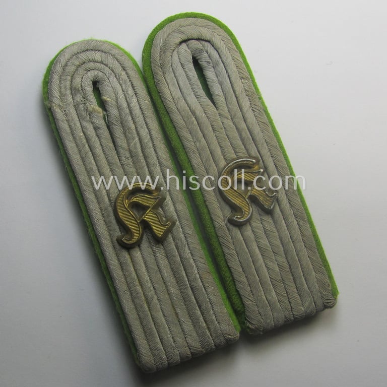 This is an attractive - and with certainty rarely seen! - pair of WH (Heeres) 'cyphered', officers'-type shoulderboards as piped in the desirable bright-green- (ie. 'hell- o. wiesengrüner'-) coloured branchcolour as was specifically intended for usage by a: 'Leutnant eines Kradschützen-Bataillons der Panzer- u. Infanterie-Divisionen' (or: lieutnant who served within a reconnaissance motorcycle-unit) and that comes in an overall nice- (I deem moderately used and/or worn-), condition. The neat shoulderboards - which are constructed from the bright-green- (ie. 'hell- o. wiesengrüner'-) coloured, 'smooth-type' (ie. moleskin-like) wool - come in a great condition overall (the pair is, however, minimally mis-matched but was most certainly always together and worn as a pair as can be seen on the pictures). The somewhat 'sub-dued' appearance of the 'upperdecks' is fully present and/or preserved (something that is to be expected for a 'Heeres'-related shoulderboard-pair). The boards are just a tiny bit 'tarnished' by normal age and/or storage for decades and do show some minimal age, wear and staining (as can be seen on the pictures). The neat boards - which measure approximately 10,7 cms. in length each - show a fully matching pair of the neat (scarcely found, Gothic-styled, golden-toned, 'Buntmetall'-based- and/or larger-sized) 'K'-cyphers (ie. 'Ziffern') period-attached denoting the officers'-rank ie. function of a: 'Leutnant eines Kradschützen-Bataillons der Panzer- u. Infanterie-Divisionen'. Both straps come mounted onto their (typically smaller-sized) tonges attached (as can be seen on the pictures). This pair originated from an older shoulderstrap ie. board-collection that I recently acquired for the web-site. Simply a very attractive, neatly 'cyphered' and/or 'Heeres'-related officers'-type shoulderboard-pair that was intended for usage by a: 'Leutnant eines Kradschützen-Bataillons der Panzer- u. Infanterie-Divisionen' and that is I deem priced according to its unmistaken scarcity and/or desirability!