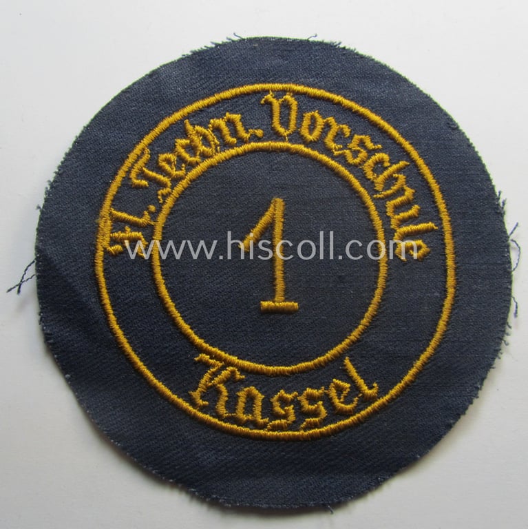 This is an attractive - and actually scarcely encountered! - HJ ('Hitlerjugend'- ie. 'Flieger-HJ'-) related and/or circular-shaped so-called: specialist-armbadge (or: 'Schulabzeichen') depicting the text: 'Techn. Vorschule d. Luftwaffe - 1 - Kassel' and that comes in an overall nice- (I deem issued albeit simply never used- nor once tunic-attached-), condition. These neat circular-shaped arm-badges signified membership within one of the technical preparatory-airforce-schools (or institutes). The badge on offer here shows membership within such a school based in the town of Kassel: there were several of these youth training-institutes - it is said that 32 of such schools existed! - that mostly functioned under the direction of one the larger air-craft industrial companies (such as: 'Focke Wulf', 'Messerschmitt' and others). The neat badge - executed in golden-yellow-coloured (linnen-based) stitching onto a blue-coloured- and/or linnen-based background - shows in its centre a larger-sized '1'-numeral and is void of an extra backing: it just shows some minimal age and/or staining (as can be noticed on the pictures). These circular-shaped badges were instituted as late as 1944 and 'replaced' the until that date used armbands (ie. 'Ärmelstreifen') having a similar text. Simply a very attractive - and surely scarcely encountered! - youth-related arm-badge ie. 'HJ-Schulabzeichen'!