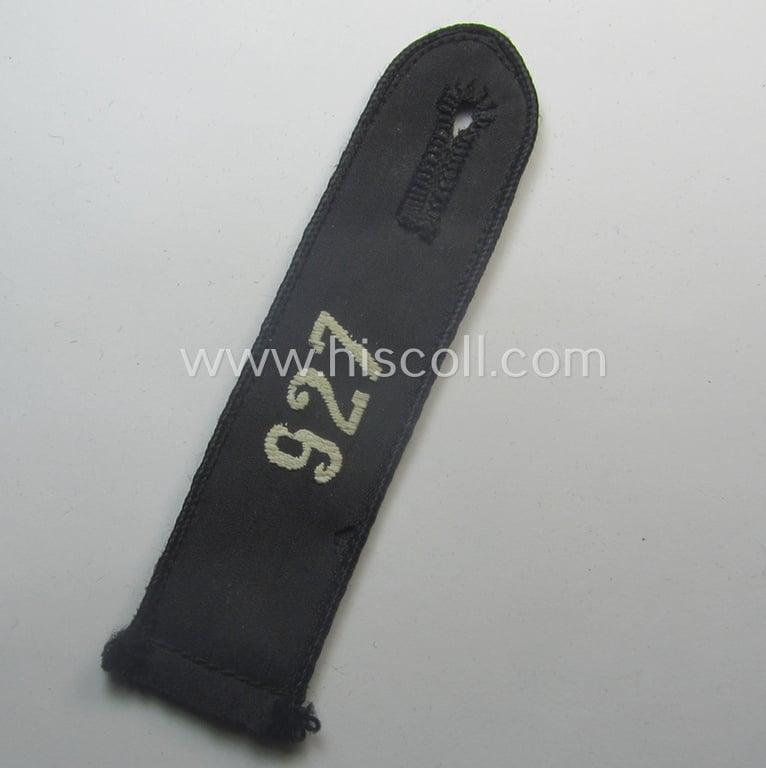 This is an attractive - truly rarely found and naturally single - typically black-piped, so-called: 'DJ- o. Deutsches Jungvolk' shoulderstrap as was specifically intended for usage by a: 'DJ-Mitglied' who served within the: 'Bann 927' (927 = 'Bann Deutsch-Przemysl' as was situated in the 'Gebiet General Gouvernement') and that comes in an overall very nice- (albeit I deem just moderately used- ie. worn-), condition. The strap - which is executed in black-coloured wool having white-embroidered '927'-numerals and black-coloured- (and/or rayon-based) piping attached - comes without tongue as found: the strap measures 11 cms. in length as is usually encountered and was worn as a piece of the 'sew-in'-pattern. The piece shows some moderate age, wear and/or staining simply caused by decades of storage and/or moderate wear. Simply an attractive - and rarely found! - so-called: 'DJ- o. Deutsches Jungvolk'-shoulderstrap that belonged to the 'HJ-Bann Deutsch-Przemysl' as was situated in the 'General Gouvernement'!