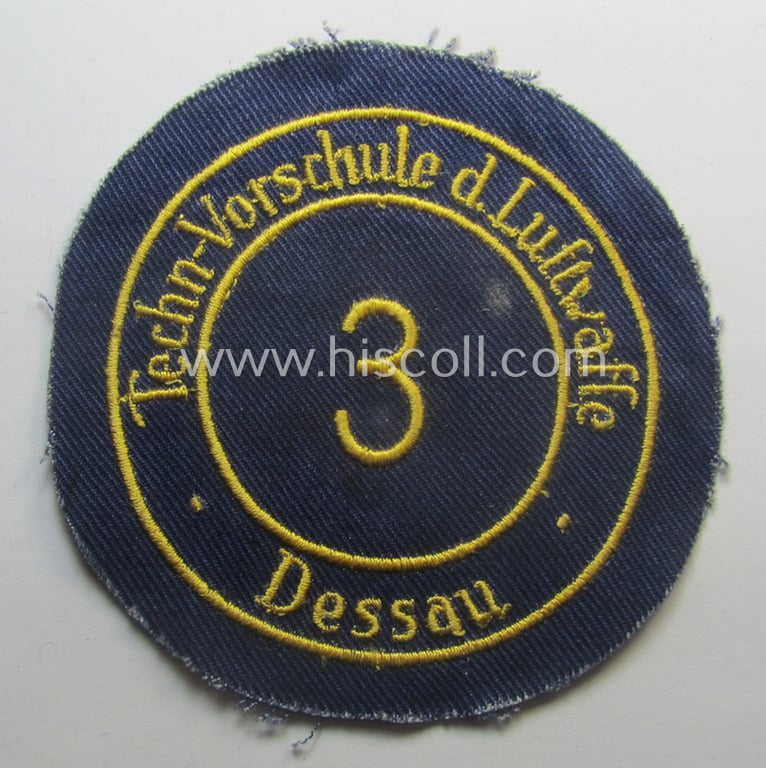 This is an attractive - and actually scarcely encountered! - HJ ('Hitlerjugend'- ie. 'Flieger-HJ'-) related and/or circular-shaped so-called: specialist-armbadge (or: 'Schulabzeichen') depicting the text: 'Techn. Vorschule d. Luftwaffe - 3 - Dessau' and that comes in an overall very nice- (I deem issued and just minimally used- ie. presumably once tunic-attached-), condition. These neat circular-shaped arm-badges signified membership within one of the technical preparatory-airforce-schools (or institutes). The badge on offer here shows membership within such a school based in the town of Dessau: there were several of these youth training-institutes - it is said that 32 of such schools existed! - that mostly functioned under the direction of one the larger air-craft industrial companies (such as: 'Focke Wulf', 'Messerschmitt' and others). The neat badge - executed in golden-yellow-coloured (linnen-based) stitching onto a blue-coloured- and/or linnen-based background - shows in its centre a larger-sized '3'-numeral and is void of an extra backing: it just shows some minimal age and/or staining (as can be noticed on the pictures). These circular-shaped badges were instituted as late as 1944 and 'replaced' the until that date used armbands (ie. 'Ärmelstreifen') having a similar text. Of additional interest is, moreover, the fact that this specimen still retains its period-attached 'RzM'-etiket (as can be noticed on the pictures). Simply a very attractive - and surely scarcely encountered! - youth-related arm-badge ie. 'HJ-Schulabzeichen'!