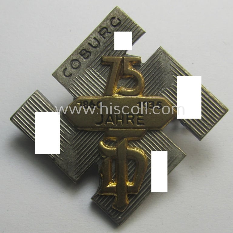 Commemorative - and 'Buntmetall'-based - 'tinnie' being a maker- (ie. 'C. Poellath'-) marked example depicting a swastika mentioning the region: 'Coburg' upon which a golden-toned 'label' showing the text: '75 Jahre - 1860 - 1936' is attached