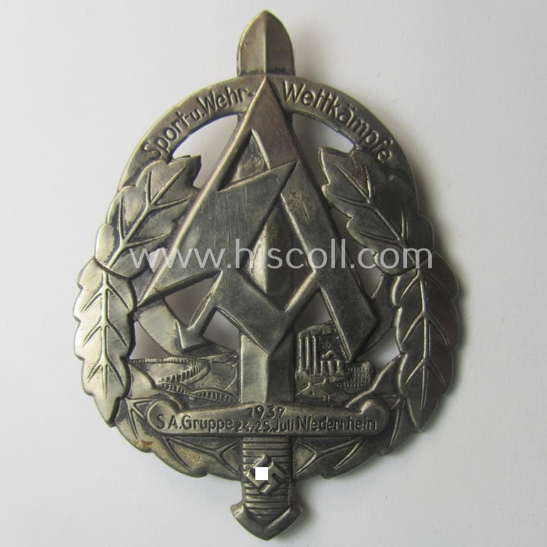Commemorative, SA- (ie. 'Sturmabteilungen'-) related 'tinnie' depicting an illustration of an 'SA-Sportabzeichen' and typical SA-logo coupled with the text: 'Sport- u. Wehrwettkämpe - SA-Gruppe 24./25.Juli - Niederrhein - 1939'