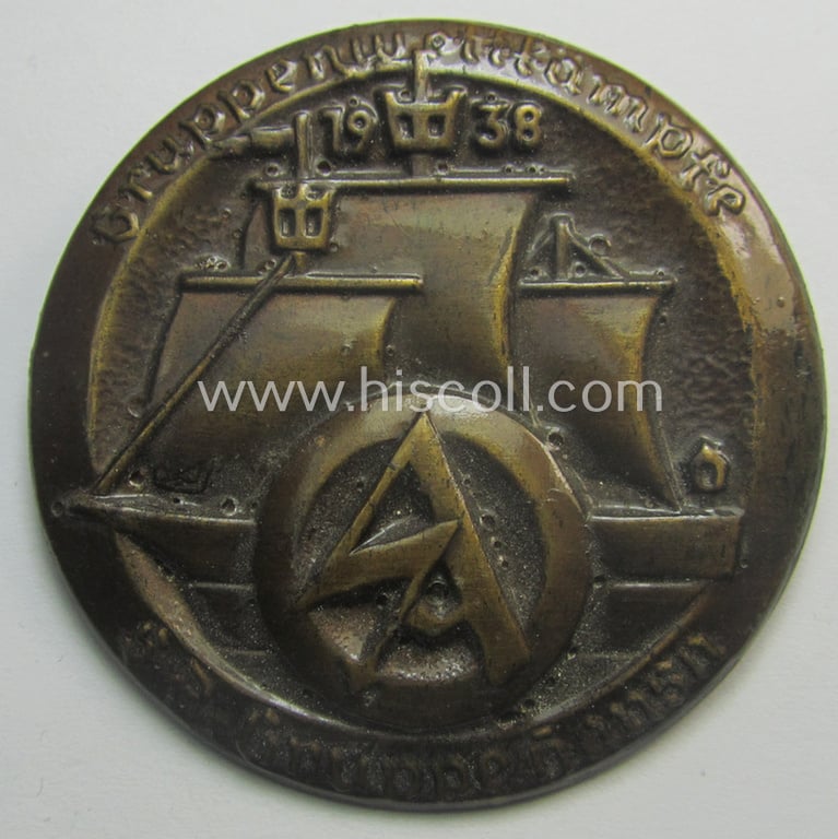 The attractive - and nicely preserved! - golden-bronze-toned SA- (ie. 'Sturmabteilungen'-) related day-badge (ie. 'tinnie' or: 'Veranstaltungsabzeichen') is (I deem) executed in (shiny!) copper-coloured and so-called tin-based- (ie. pot-) metal: it shows some normal wear and/or moderate age but has presumably never been cleaned nor polished (it is still a bit dirty but has maintained a nice, somewhat tarnished age-patina). The circular-shaped day-badge comes mounted onto its functional pin-/catch set-up and shows some minimal age ie. staining (as can be seen on the pictures). The 'tinnie' is very detailed and retains most (ie. all) of its darkened, golden-bronze-coloured finish (as can be seen on the pictures). The piece shows a detailed SA-logo and 'Hansa'-sailing-ship coupled with the text: 'Gruppenwettkämpfe - SA-Gruppe Hansa - 1938'. Simply an attractive - and actually not often encountered! - SA- (ie. 'Sturmabteilungen'-) related tinnie that is with certainty accordingly priced!