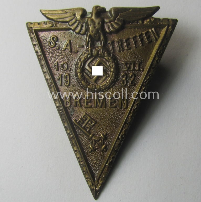 The attractive - truly early-period and actually unusually ie. rarely seen! - golden-bronze-toned, SA- (ie. 'Sturmabteilungen'-) related day-badge (ie. 'tinnie' or: 'Veranstaltungsabzeichen') is (I deem) executed in golden-bronze-coloured and (I deem) so-called tin-based- (ie. pot-) metal: it shows some normal wear and/or moderate age but has presumably never been cleaned nor polished (it is still a bit dirty but has maintained a nice, somewhat tarnished age-patina). The peculiar-shaped day-badge comes mounted onto its functional pin-/catch set-up and shows some minimal age ie. staining (as can be seen on the pictures). The 'tinnie' is very detailed and retains most (ie. all) of its darkened, golden-bronze-coloured finish (as can be seen on the pictures). The piece shows a detailed early-pattern, 'Reichsadler'-device coupled with the text: 'SA-Treffen - 10.VII. - 1932 - Bremen'. Simply an attractive - and actually not that often ie. quite rarely encountered! - early SA- (ie. 'Sturmabteilungen'-) related tinnie that is with certainty accordingly priced!