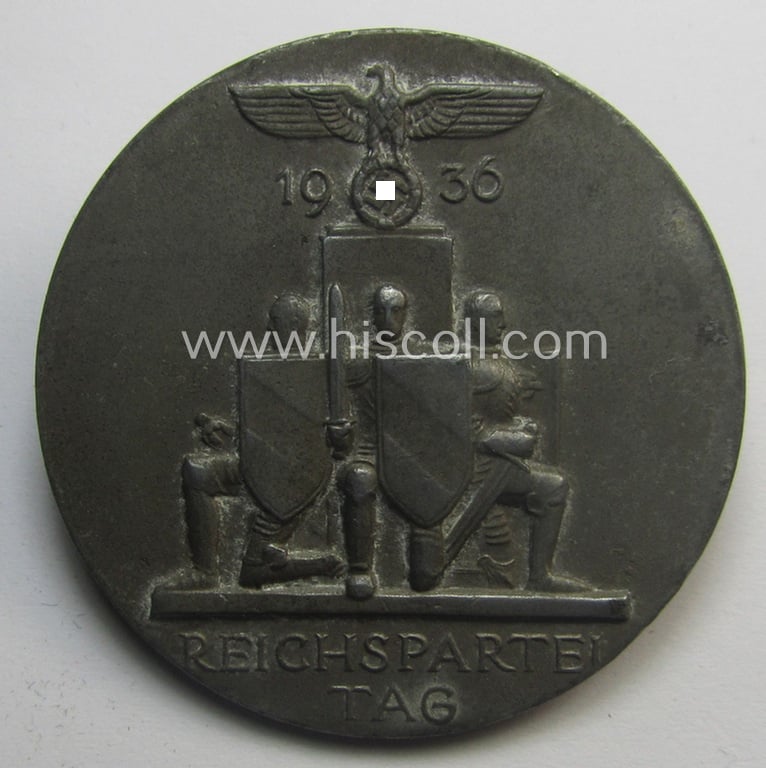 N.S.D.A.P.-related 'tinnie' (ie. 'Tagungs- o. Veranstaltungsabzeichen'-) being a maker- (ie. 'E.F. Wiedmann - Frankfurt a. M.'-) marked example depicting the text: 'Reichsparteitag 1936'