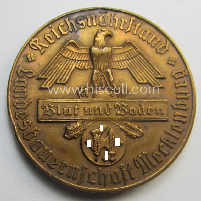 This is an attractive - and with certainty scarcely encountered! - bright-golden-toned (and I deem typical 'Buntmetall'-) based, so-called: 'Reichsnährstand des Landesbauernschaft Mecklenburg'- (ie. 'RNSt.'-) related, commemorative loyal-service plaque (ie. 'Nichttragbare Plakette des Landesbauernschaft Mecklenburg') being a (typical) non-maker-example showing on its front the text: 'Reichsnärstand - Landesbauernschaft Mecklenburg - Blut und Boden' and on its back an illustration of a bull surrounded by the text that reads: 'Für Treue am Baurerntum - 20 Jahre' and that comes in an overall nice- (albeit surely issued- ie. worn-), condition. The round-shaped piece is executed in bright golden-toned (ie I deem 'Buntmetall'-based) metal: it shows some normal wear and/or moderate age but has apparently never been (recently) cleaned nor polished (it is still a tiny bit dirty but has maintained a very nice, just minimally tarnished, age-patina). This particular piece originates from an extensive and larger-sized 'Reichsnährstand'- (ie. 'RNSt.'-) related collection that was compiled over 40 years and that I recently acquired for the web-site. Simply a nice occasion to acquire a neat: 'Reichsnährstand des Landesbauernschaft Mecklenburg'-related, so-called: 20-years-loyal-service plaque for an interesting and I deem justified price!