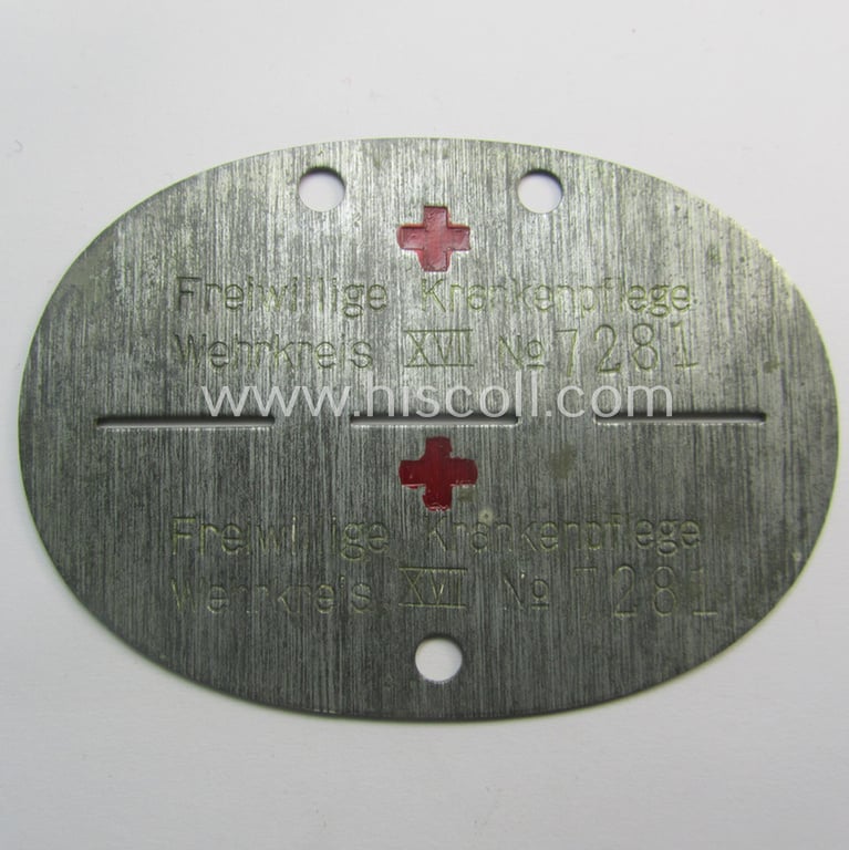 'DRK' (ie. 'Deutsches Rotes Kreuz') and (European) volunteer-related, zinc-based ID-disc bearing the engraved unit-designation: 'Freiwillige Krankenpflege - Wehrkreis XVII - No. 7281'