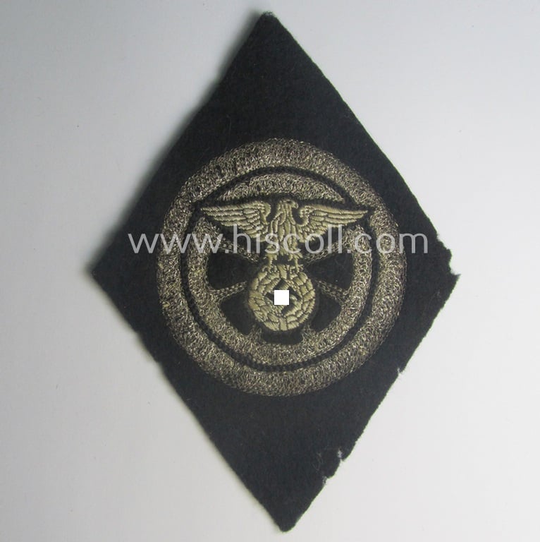 This is an attractive - and with certainty unusually seen! - example of the larger-sized- (ie. measuring 14,5 x 10 cms.) and neatly 'Raute'-shaped (I deem) sports'-shirt patch (ie. 'N.S.K.K.-Brustabzeichen für das Sporthemd') as was used by the various officials serving within the: N.S.K.K. (ie. 'National Socialistisches Kraftfahr Korps') that is executed in detailed machine-embroidery onto a black-toned and woolen-based background and that comes in a just moderately used- ie. worn, condition. I deem that these (fairly early-period- ie. most certainly pre-war) patches were worn on the breasts of the training-jackets and other sports'-gear. The patch shows a (detailed!) machine-embroidered, early eagle-device and (braid-based!) wheel surrounded by a (tarnished-silver-toned and equally braid-based) 'circle'. This particular (and interesting!) example originated from the famous Dave Delich collection. Simply a neat - and actually never before encountered! - N.S.K.K.- ie. sports-related breast-patch that is (I deem) accordingly priced!