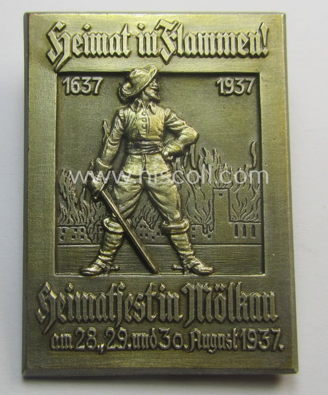 Commemorative- and/or aluminium-based, silver-toned 'tinnie' being a maker- (ie. 'Brehmer - Markneukirchen'-) marked example showing the text: 'Heimat in Flammen - 1637-1937 - Heimatfest in Mölkau - 28.-30. August 1937'
