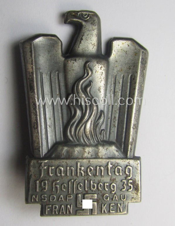 Silver-toned, N.S.D.A.P.-related 'tinnie' (ie. 'Tagungs- o. Veranstaltungsabzeichen'-) being a non-maker-marked example showing the text: 'Frankentag - Hesselberg - N.S.D.A.P. - Gau Franken - 1935'