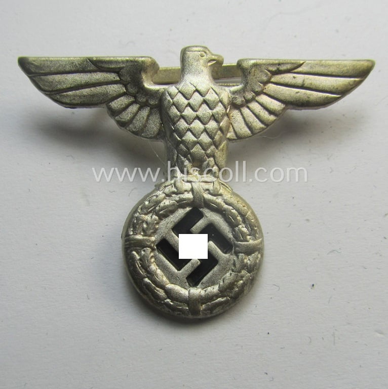 This is an attractive - and quite detailed! - (frosted!) silver-toned- and/or (I deem) typical 'Buntmetall'-based- (and/or truly early-pattern!) political-styled (ie. SS- o. SA-type-) visor- (ie. 'Schirmmützen o. Kepi'-) cap-eagle being a (typical) non-maker-marked example that comes in an overall very nice- (ie. I deem still 'virtually mint- ie. unissued'-), condition. These eagles were intended for usage on the various (early-pattern) visor-caps (ie. 'Schirmmützen o. Kepi's') of one of the national-socialistic- (ie. party related-) organisations such as the SS and SA. The eagle has truly great pronounced detail and retains both of its (silver-toned and of course still functional) pins ie. prongs in place. The piece - which is right-facing and that is having an approximate 'wing-span' of 3,7 cms. - has most certainly never been cleaned nor polished and has a minimally tarnished 'age-patina' (as can be seen on the pictures). Simply a very attractive - and detailed! - 'early-pattern'-styled visor-cap-eagle that is accordingly priced!