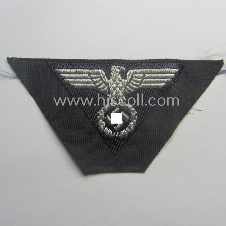 This is an attractive - and simply never used nor side-cap-attached! - example of a so-called: DAF- (ie. 'Deutscher Arbeits Front'-) related side-cap-eagle (ie. 'Adler für Schiffchenmütze') as was specifically intended to be worn onto the darker-blue-coloured, 'DAF-Schiffchen- o. Lagermütze' being a (typical) 'BeVo'-woven example that comes mounted onto a black- (ie. 'schwarzer'-) coloured background and that comes in an overall very nice- (ie. still 'virtually mint ie. unissued'-), condition. The cap-eagle is neatly woven in the so-called: 'BeVo'-weave, 'flat-wire'-technique (as can be seen on the pictures). The trapezoid-shaped piece was never used nor trimmed ie. pre-folded and comes as 'straightly cut-of the role' (as can be seen on the pictures). Simply a very attractive DAF- (ie. 'Deutscher Arbeits Front'-) related example that will be impossible to be upgraded!