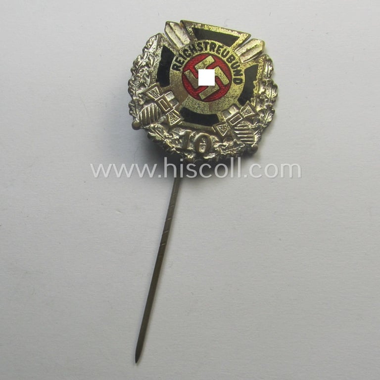 This is an attractive example of the neatly designed and semi-enamelled, commemorative 10-years membership lapel-pin (or: 'Mitgliedsabzeichen') that is also known as the: 'Silberne Ehrennadel für 10 Jahre Mitgliedschaft im Reichstreubund ehemaliger Berufssoldaten (o. RTB)' being a detailed example that comes in an overall very nice- (albeit minimally used- ie. worn-), condition. The lapel-pin shows some minor wear and/or staining but shows no damage whatsoever: it does show some minor age- and/or staining as ismore often observed. On its back the pin shows a 'Ges.Gesch.'-patent-pending marking and also shows a clear makers'-designation that reads: 'Gante - Berlin'. The neat pin - which has a functional, long-sized pin in place - is also figured in the Heering-Hüsken 'Abzeichen'-catalogue wherein it is given a unique-number (9668D). Simply a neat 'Mitgliedsabzeichen' that belonged to a member who was active in one of the lesser-known TR-organisations and that is with certainty accordingly priced!