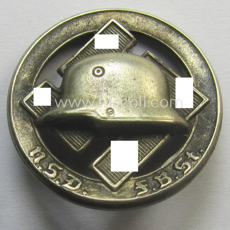 This is an attractive membership lapel-pin (ie. 'Mitgliedsabzeichen') that signified membership within the: 'Nationalsozialistischer Deutscher Frontkämpferbund Stahlhelm' (or: 'N.S.D.F.B.St.') being a very detailed- and/or: neatly maker- (ie. 'M.K. - Ges.Gesch'-) marked example that is executed in silver-coloured, so-called: 'Buntmetall' and that comes in an overall very nice- (and I deem only moderately used- ie. worn-), condition. The badge shows a German steelhelmet mounted onto a swastika-sign which is surrounded by the abbreviation: 'N.S.D.F.B.St.' - and has (I deem) never been cleaned nor polished and still retains a truly nice and only slightly darkened- ie. tarnished, age-patina. This example shows a clear: 'M.K. - Ges.Gesch'- (maker) ie. patent-pending-designation on its back and comes mounted onto its typical (possibly period-replaced but functional) pin- ie. catch-set-up. This badge - which is of the regular (ie. circular-shaped) type - is also figured in the 'Heering-Hüsken' lapel-pin-catalogue wherein it is given a unique reference-number (4127A). I deem this is a most certainly decorative badge which I have priced according to its nicely preserved condition!