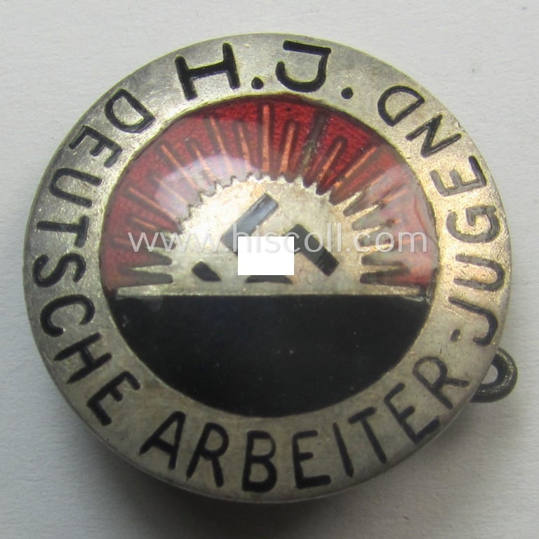 This is a neat - albeit moderately used- and/or worn! - example of a truly early-period, multi-coloured-enamelled so-called: 'Mitgliedsabzeichen' (or: membership-lapel-pin) as was specifically intended to signify membership within the: 'HJ' (or: 'Hitlerjugend') before June 1932, being a 'regular'-sized badge of the 1st pattern that is totally void of a makers'-designation (but that does show an: 'RzM'- and/or 'Ges.Gesch.'-patent-pending-designation on its back) and that comes in an overall nice- (albeit I deem clearly used and/or worn-), condition. The lapel-pin shows some regular wear and age but shows a totally undamaged, enamelled surface. It has - I deem - never been cleaned and retains a somewhat tarnished- and/or minimally shiny age-patina. The pin - which comes mounted onto its functional pin-/catch set-up - is also figured in the Heering-Hüsken 'Abzeichen'-catalogue, where it is given a unique reference-number (9301A). This is a 'standard-issued' badge of the 1st pattern: something that is easily recognisable due to the fact that it depicts a 'swastika' sun-rise coupled with the text: 'H.J. - Deutsche Arbeiter Jugend'. Simply a neat and decorative (early-period!) TR- ie. HJ-related lapel-pin that is most certainly accordingly priced!