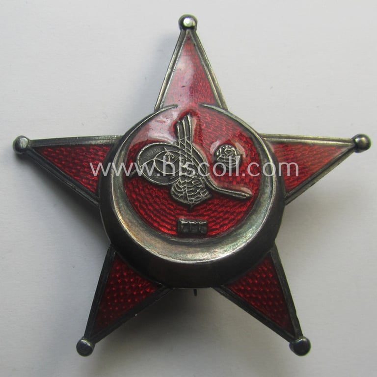 This is a truly very attractive - and actually scarcely encountered! - WWI-era, Turkish military bravoury-award being an: 'Eiserner Halbmond' (also known as: 'Stern von Gallipoli' or: 'Turkischer Halbmond') being a luxurious, single-pieced - albeit typical unmarked - example which is executed in silvered metal (ie. 'Buntmetall') and that comes in an overall very nice- (and fully undamaged and untouched!), condition. The neat piece - that was also bestowed on German nationals ie. military staff (mainly officers!) and can as such also be encountered being worn throughout the TR-era - is of a truly luxurious version: it is a neat 'single-pieced' example that shows fine detail. The piece was recently uncovered at a German private-household and was most certainly a piece that was awarded to a German soldier. The piece - which can easily be graded like an Iron Cross 1st class (or: 'Eisernes Kreuz 1. Klasse') - comes mounted onto its original pin and retains a fully functional (and unaltered!) catch (-set-up). The piece retains all of its bright-red enamelled surface without showing any defaults nor damages as can be noticed on the pictures). It comes naturally mounted on its functional (thin-shaped-) pin- ie. pin-/catch set-up. It was - I deem - just moderately worn but still retains a bright age-patina and was I deem never cleaned nor polished. It should be noted that this is a fairly scarcely encountered foreign-award that was (presumably) produced in the thirthies. Of course, did I price this neat - and/or luxuriously produced! - example according to its very nice and/or fully untouched condition!