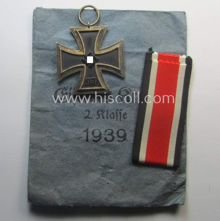 Superb - and very rarely found! - 'Eisernes Kreuz 2. Kl.' (ie. Iron Cross 2nd Class) being a maker- (ie. '75'-) marked example that comes stored in its period 'Zellstoff'-based pouch by the: 'Julius Maurer'-company