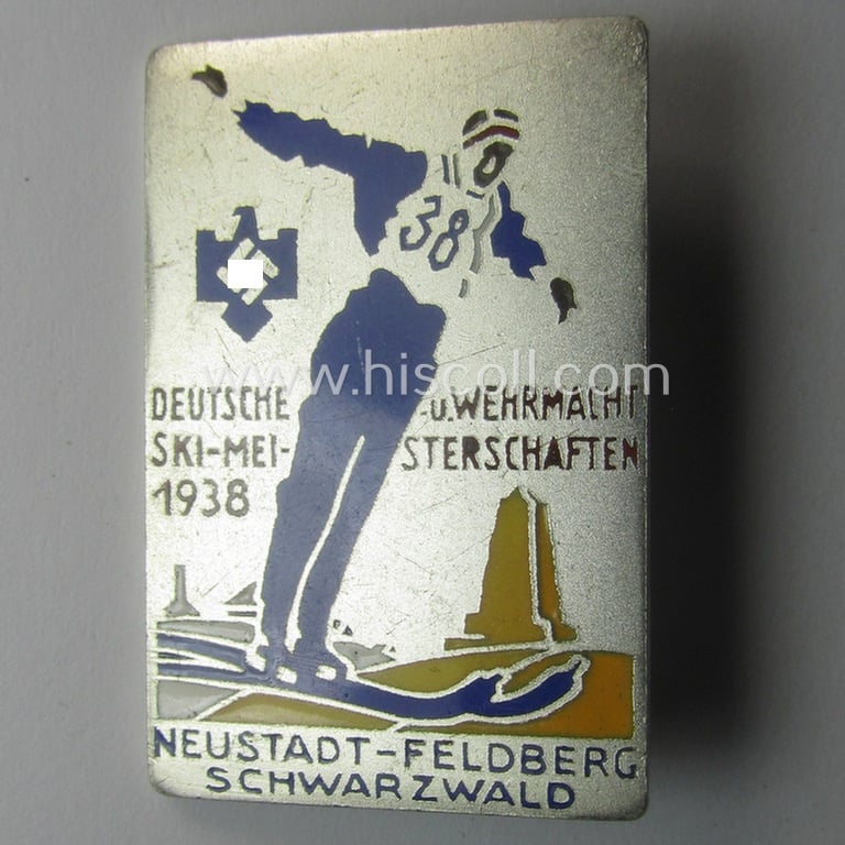 Semi-enamelled- and bright-silver-toned, 'N.S.R.L.'-related day-badge (ie. 'tinnie' or: 'Veranstaltungsabzeichen') as was issued to commemorate participation within the: 'Deutsche u. Wehrmacht Ski-meisterschaften 1938'