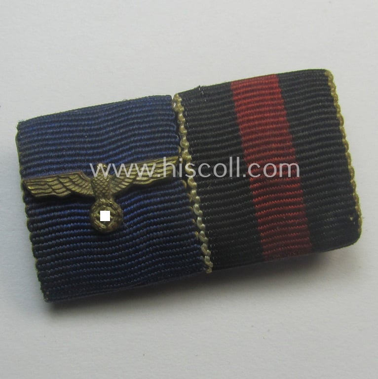 This is a neat example of a two-pieced, WH (Heeres o. Kriegsmarine) ribbon-bar (ie. 'Feld- o. Bandspange') showing respectively the confectioned ribbons for a: WH (Heeres o. KM) 'Dienstauszeichnung der 4. Stufe' (as was awarded for 4 years of loyal-service) that shows a silver-toned eagle-device and a: WH Czech occupation ie. 'Anschluss' medal: '1 October 1938' (as was awarded to all members of the armed forces that participated in the German occupation of Czechoslovakia, which started on 1 October 1938) and that comes in an overall nice- (albeit moderately used and/or worn-), condition. Both ribbons are of the regular (ie. smaller-sized) ribbon-bar-size and measure approximately 1,5 cms. each as is more often encountered (the piece has a total length of approximately 3 cms.) and is not 'backed' but comes mounted onto a metal backing-plate (as can be seen on the pictures). The piece does show some minimal age, wear and/or staining. Simply a neat, two-pieced WWII-period 'Feld- o. Bandspange' that can be used for almost any TR-period-tunic!