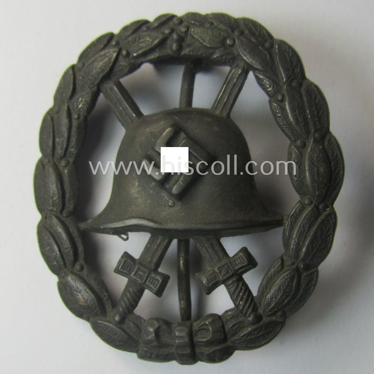 This is an attractive - and I deem just moderately used and/or worn - example of a (non-magnetic) black-class wound-badge (ie. 'Verwundeten-Abzeichen in Schwarz') being of the scarcely observed - (ie. early-period- aka 'Spanish Civil-War'- or: 'Legion Condor'-) pattern of the 'Durchbrochener'-type that comes in an overall very nice- (and I deem just moderately used ie. worn-), condition. The (magnetic!) wound-badge - which is an unmarked version that shows a pronounced swastika as more often encountered - just shows moderate wear ie. age and retains, however, a neat and just somewhat 'tarnished' ie. matted age-patina: moreover, does it retain almost all of its somewhat 'satin'-styled black-painted finish (as can be seen on the pictures). The badge - which comes naturally mounted onto its functional, regular-sized- (and also non-magnetic- ie. copper-toned) pin and that has an undamaged and/or: functional catch - still retains extraordinary and/or pronounced detail (as can be seen on the pictures). I am of the opinion, that the piece on offer here is a 100% genuine, period-example that was obviously worn: it originates from a private-household in Germany and was never before in collectors'-hands. The piece was never cleaned nor polished and comes as found. In any case an attractive - and most certainly original! - early-pattern, black-class specimen of the 'Durchbrochener'-pattern that is - I deem - priced according to its fully untouched and just moderately worn condition!