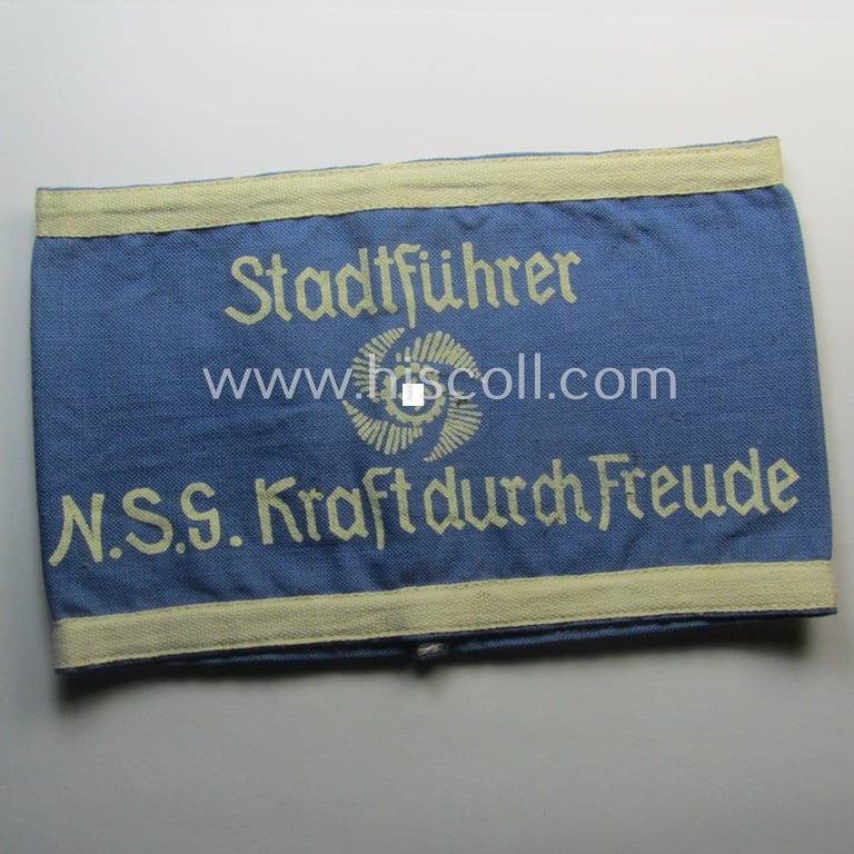 Unusually seen, linnen-based- and/or light-blue-coloured, DAF- (ie. KDF-) related armband (ie. 'Armbinde') showing white-linnen-toned borders and depicting the typical 'KDF'-logo and text: 'Stadtführer - N.S.G. Kraft durch Freude'