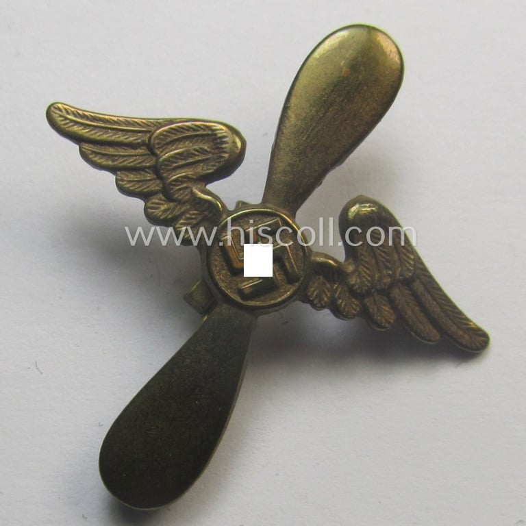 This is an attractive - and I deem only moderately used! - example of a specific DLV- (ie. 'Deutscher Luftsport Verband'-) related collar-tab-'cypher' (ie. 'Kragenspiegel-Auflage für die Kragenspiegel des DLV') being a 'Buntmetall'-based- and/or clearly maker- (ie. 'P&C'- and/or: 'Ges. Gesch.'-) marked example that shows a swastika-device and that comes iin an overall nice- (I deem moderately used- and/or once collar-tab-attached-), condition. The 'cypher' depicts a 'winged propellor' with in its center a swastika-device and does still retain both its (once bent but still functional) copper-based prongs in place. Simply a neat occasion to acquire a (not that often seen!) 'Kragenspiegel-Auflage für die Kragenspiegel des DLV' for a competitive price!