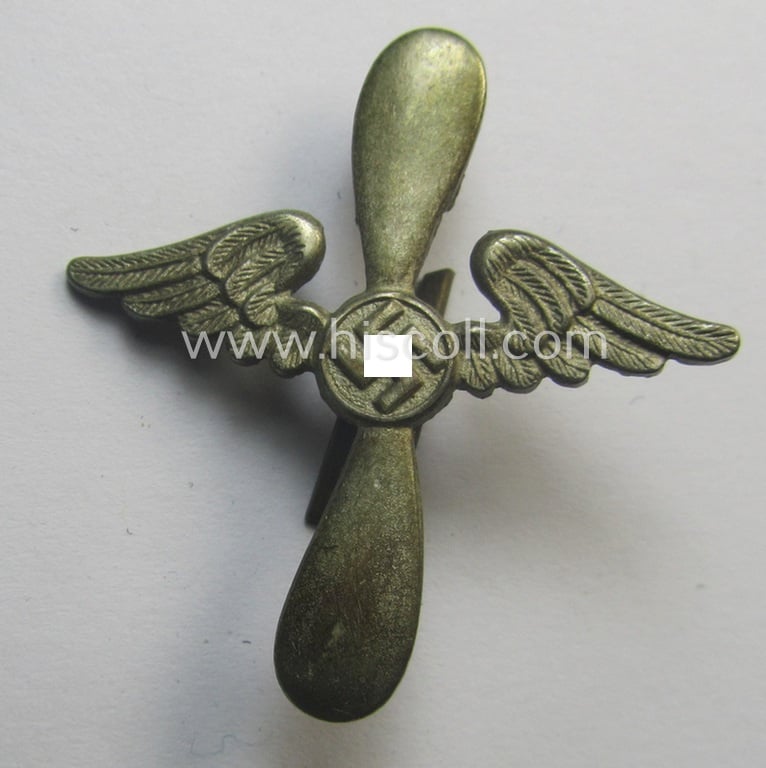This is an attractive - and I deem only moderately used! - example of a specific DLV- (ie. 'Deutscher Luftsport Verband'-) related collar-tab-'cypher' (ie. 'Kragenspiegel-Auflage für die Kragenspiegel des DLV') being a 'Buntmetall'-based- and/or clearly maker- (ie. 'P&C'- and/or: 'Ges. Gesch.'-) marked example that shows a swastika-device and that comes iin an overall nice- (I deem moderately used- and/or once collar-tab-attached-), condition. The 'cypher' depicts a 'winged propellor' with in its center a swastika-device and does still retain both its (once bent but still functional) copper-based prongs in place. Simply a neat occasion to acquire a (not that often seen!) 'Kragenspiegel-Auflage für die Kragenspiegel des DLV' for a competitive price!