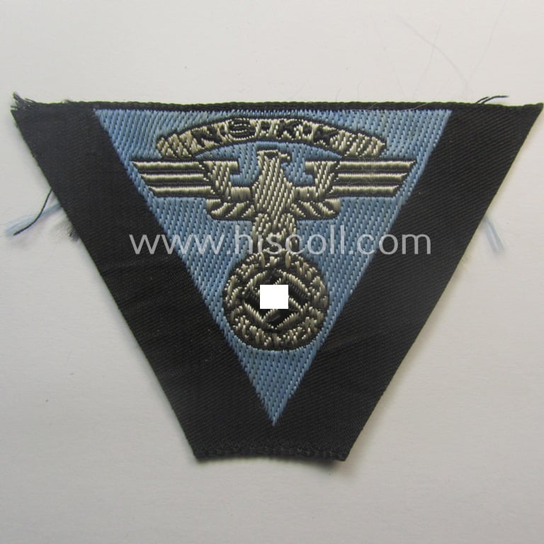 This is an attractive - and simply never issued nor used! - example of a so-called: N.S.K.K. (ie. 'National Socialistisches Kraftfahr Korps') side-cap-eagle (ie. 'Adler für Schiffchen o. Schaftmütze') as was specifically intended to be worn onto the black-coloured 'N.S.K.K.-Schiffchen- o. Lagermütze' being a neatly 'BeVo-woven' example that comes mounted onto a light-blue- (ie. 'hellblauer'-) coloured background and that comes in an overall very nice- (ie. still 'virtually mint ie. unissued'-), condition. The cap-eagle - which is neatly woven in the so-called: 'BeVo'-type-weave-technique - has the light-blue- (ie. 'hellblauer'-) coloured branchcolour and was as such intended for the N.S.K.K.-staffmembers that belonged to the: 'N.S.K.K.-Motorgruppe Bayerische Ostmark' (as can be seen on the pictures). The trapezoid-shaped piece was never used nor trimmed ie. pre-folded and comes as 'straightly cut-of the role' as can be seen on the pictures). Simply a very attractive example that will be impossible to be upgraded!