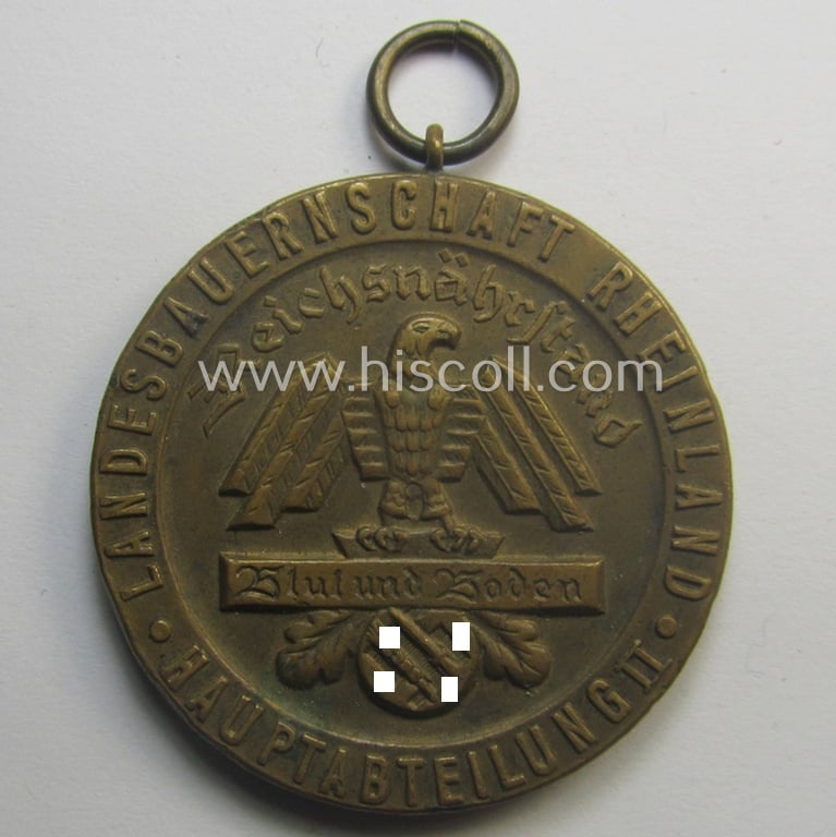 Darkened reddish-bronze-toned, typical 'Reichsnährstand'- (ie. 'RNSt.'-) related, (portable) award entitled: 'Reichsnährstand - Landesbauernschaft Rheinland - Abteilung II - Für Leistungen im Obstbau'