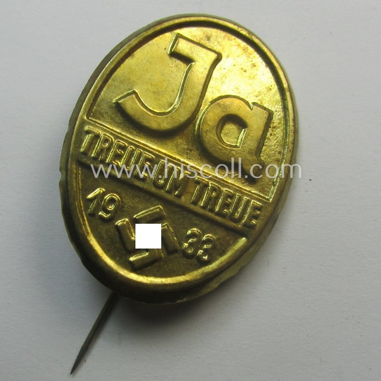 The attractive - fairly early-period and truly nicely preserved! - golden-bronze-toned N.S.D.A.P.-related (suportive) day-badge (ie. 'tinnie' or: 'Veranstaltungsabzeichen') is (I deem) executed in golden-coloured and so-called tin-based- (ie. pot-) metal: it shows some normal wear and/or moderate age but has presumably never been cleaned nor polished (it is still a bit dirty but has maintained a nice, somewhat shiny age-patina). The oval-shaped day-badge comes mounted onto its functional long-sized pin and shows some minimal age ie. staining (as can be seen on the pictures). The 'tinnie' is very detailed and retains most (ie. all) of its somewhat bright, golden-coloured finish (as can be seen on the pictures). The piece shows a the large capitals ie. wording 'JA' and swastika coupled with the text: 'Treue um Treue - 1933'. Simply an attractive - and actually not often encountered! - regionally-issued, N.S.D.A.P.-related (suportive) tinnie that is with certainty accordingly priced!