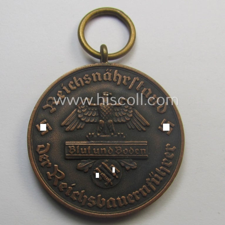 Smaller-sized and reddish-bronze-toned, typical 'Reichsnährstand'- (ie. 'RNSt.'-) related, (portable) honorary-award entitled: 'Reichsnährstand - Der Reichsbauernführer - Für hervorragende Verdienste auf dem Gebiet der Tierzucht'