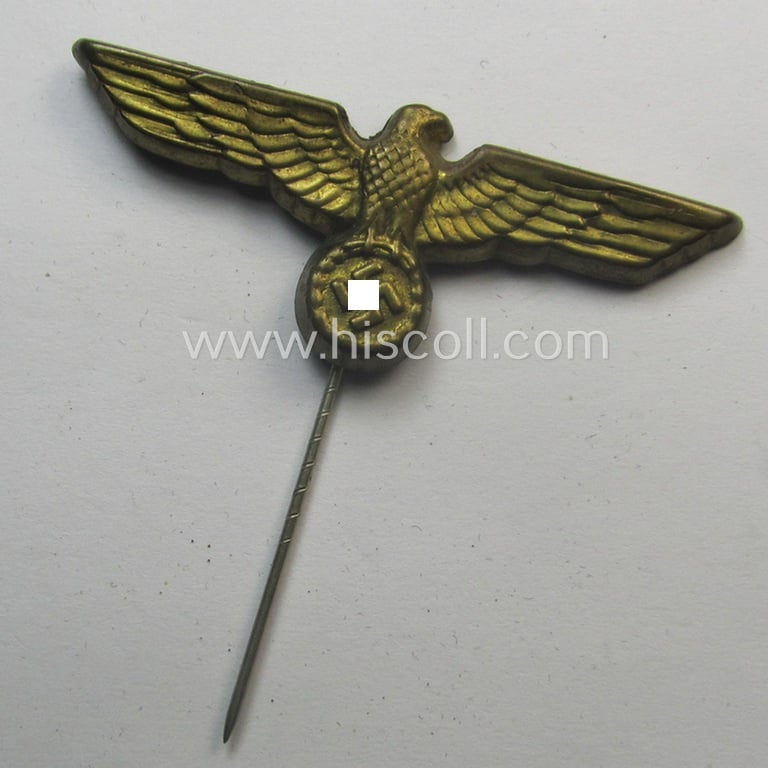 This is a neat example of a (tarnished) golden-toned, WH (Kriegsmarine) so-called: 'single-pattern'-eagle-pin being a (typical) non-maker-marked, zinc-based example as was specifically intended for attachment onto the (darker-blue- ie. white-topped-) so-called: Kriegsmarine-related: 'Tellermützen' and that comes in an overall nice- (albeit I deem clearly used- ie. most certainly once cap-attached-), condition. The piece on offer here is the so-called: 'one-pieced'-model, showing a golden-toned, zinc- (ie. 'Feinzink'-) based eagle-device without attached cocarde. The piece was clearly used ie. worn but nevertheless retains all of its golden-toned finish: the piece is just a bit tarnished caused by moderate wear. The eagle-pin was - I deem - never cleaned and comes as recently found (it does show some minimal staining). The piece comes of course mounted onto its original, full-sized, pin. Simply a nice, naval replacement-piece that is I deem accordingly priced!