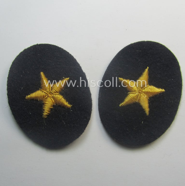 Both detailed - and fully matching! - WH (Kriegsmarine) (specialist) arm-badges - which were to be mounted on both lower-arm-regions of the various blue-coloured officers'- (ie. evt. NCO-) type tunics - depict a (golden-toned and very detailed!) 5-pointed 'star'-device (as can be seen on the pictures). They are both executed in bright-yellow- (ie. golden-) coloured 'Cellueon'-based material onto a dark-blue-coloured and/or typical woolen-based background and were as such intended for usage onto the blue-coloured navy attire. Both insignia-pieces do show extraordinary craftmenship and are additionally backed with a piece of beige-coloured paper (as can be seen on the pictures). The set was in my opinion issued but never used nor once tunic-attached and do both show some minimal age ie. staining caused by decades of storage only. It sounds maybe strange but all WH (Kriegsmarine) officers'-type, career- ie. specialist-armbadges are quite hard to encounter and can easily be graded fairly 'scarce'. I deem that this attractive set is accordingly priced!