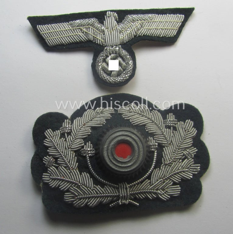 Superb - and detailed! - WH (Heeres) officers'-pattern, visor-cap eagle/cocarde-set (ie. 'Effektensatz für Schirmmütze') being both hand-embroidered examples that come mounted onto a typical darker-green-coloured- and/or woolen-based background