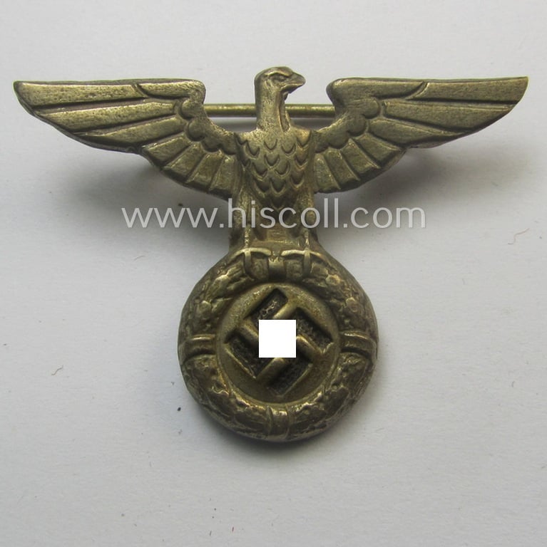 Silver-toned - and 'Buntmetall'-based - early-pattern, SS- o. SA-type, political visor- (ie. 'Schirmmützen'-) cap- (ie. 'Kepi'-) eagle being a non-maker-marked example that comes in a used- ie. carefully cap-removed, condition