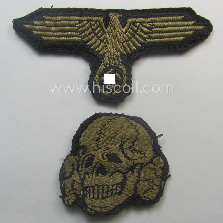 Superb - and nowadays rarely encountered! - Waffen-SS, 'BeVo'-woven-style skull- and cap-eagle-set (ie. 'Totenkopf- u. Adler-Effektensatz für Schiffchen o. Einheitsfeldmütze') that comes in a just moderately used- and/or cap-removed, condition
