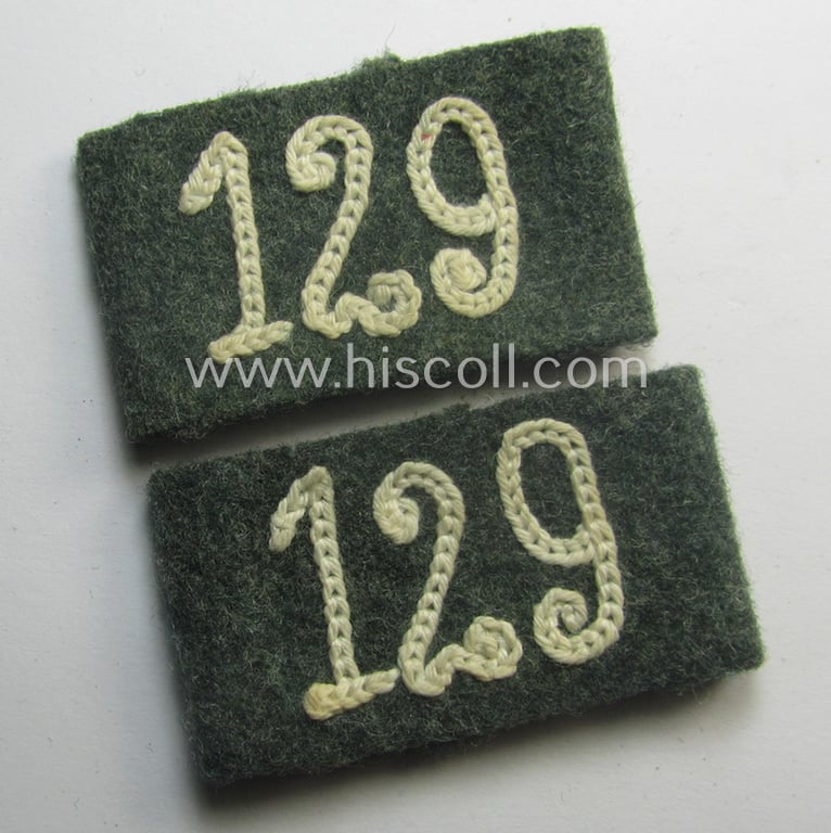 This is an attractive - truly matching and/or fully identical! - pair of WH (Heeres) 'Infanterie'-related, so-called: regimental shoulderstrap-'slip-ons' (ie. 'Schulterstück-Überschuben') as was specifically intended for usage by a: 'Soldat des Infanterie-Regiments 129' and that comes in an overall very nice- (and I deem simply never worn- nor used- ie. still 'virtually mint unissued'-), condition. The pair is neatly 'machine-stitched'-embroidered in the typical white- (ie. 'weisser'-) coloured wool by means of so-called: 'Kurbelstickerei' as to be expected. Simply a nice opportunity to aquire an attractive pair of 'Infanterie'-related 'Überschuben' that is - I deem - accordingly priced: great to 'decorate' a pair of 'weisser'-piped 'Heeres'-shoulderstraps or ideally fitted to keep in any insignia-collection!