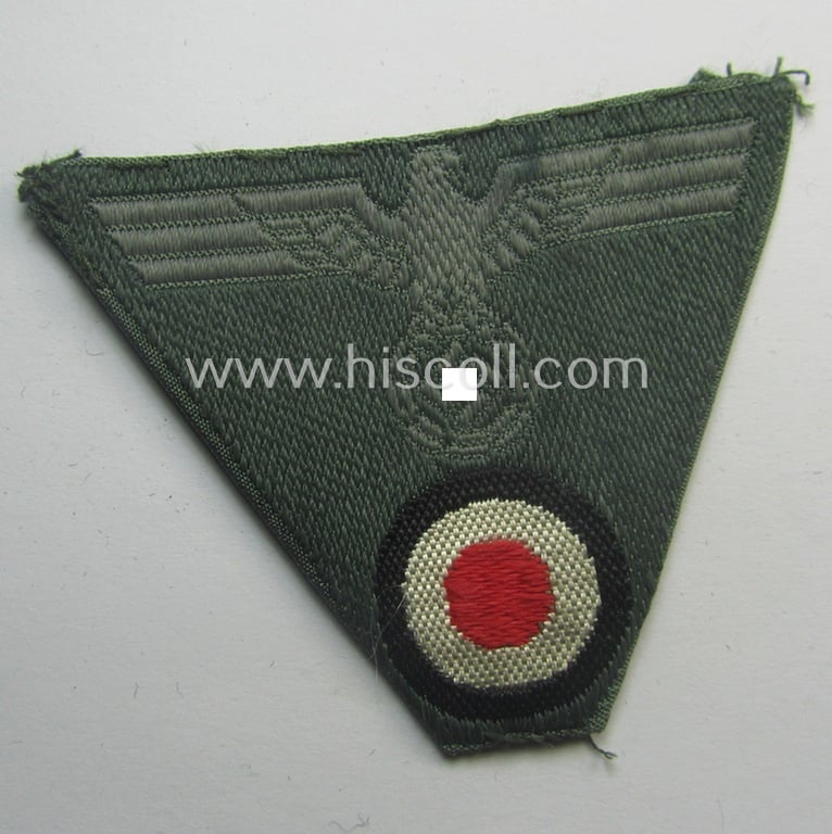 This is a neat - and I deem used and/or carefully cap-removed! - example of the 'standard-issue'-type, WH (Heeres) so-called: 'M43-pattern'-cap-eagle/cocarde (ie. cap-trapezoid) as was specifically produced for usage on the so-called: 'M-43'-model field-caps (ie. 'Einheitsfeldmützen') and that comes in a just minimally used- (ie. I deem once cap-attached-), condition. The piece is executed in the so-called: 'BeVo'-weave-pattern and was nicely confectioned ie. pre-folded (and I deem once cap-attached) and that comes as recently found. The piece - that was once cap-attached by means of hand-stitching - is executed in bluish-grey-coloured linnen on a field-grey-coloured (and/or also linnen-based) background and does show some minimal age, wear and/or staining ie. storage-age (as can be seen on the pictures). Simply a neat occasion to aquire an attractive, truly worn and 'BeVo'-woven cap-trapezoid for a competitive price!