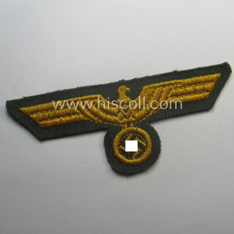 This is an very attractive example of a WH (Kriegsmarine) breast-eagle (ie. 'Brustadler für Mannschaften u. Uffz. der Kriegsmarine o. Küsten-Artillerie') being a 'standard-pattern'- and machine-embroidered example on a field-grey-coloured (and typical smooth-woolen-based!) background and that comes in a simply never used- (ie. still 'virtually mint'-), condition. The piece - which is of the pattern that was worn on the various field-grey-coloured tunics and attire throughout the war - comes in a never tunic-attached condition. It is nicely machine-embroidered in golden-yellow-toned linnen and is executed on a typical, field-grey-coloured- (and woolen-based) background. The piece - that is void of an additionally 'backing' but that shows a linnen-based reinforcement (as can be noticed on the pictues) - just shows some minor staining simply caused by handling and storage: moreover, was it once glued into an album or scrapbook and does show some minimal glue- ie. carton-remains on its back. This example originated from a small naval breast-eagle-collection I recently acquired for the web-site. I deem that this very attractive - and I deem simply never used! - WH 'Kriegsmarine o. Küsten-Artillerie- o. Küstenmarine'-related breast-eagle is accordingly priced!