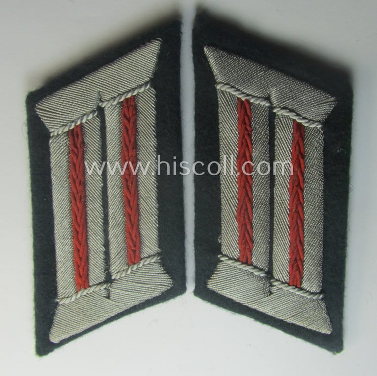 The attractive - and actually scarcely found! - WH (Heeres) officers'-type collar-tabs (ie. 'Kragenspiegel für Offiziere des Heeres') are typical, 'text-book'-examples of the Heeres-pattern, officers'-type, 'Feldgendarmerie o. Akademie'- (ie. field-police-troops- or academy-member) related officers-type collar-tabs and have the silverish-grey- (ie. clearly somewhat 'sub-dued'-type- and just minimally darkened) silver-toned hand-embroidery. The tabs were most certainly worn and carefully tunic-removed and came as stored for decades (as can be seen on the pictures). The tabs show the desirable bright-orange- (ie. 'orangeroter'-) coloured branchcolour (and were constructed from the 'smooth-type' wool as to be expected). Taking into account, the fact that this pair has the somewhat 'sub-dued'-type embroidery I deem that it was a pair that was intended to be used on a regular 'front-used'-tunic. It should be mentioned that these officers'-pattern, 'Feldgendarmerie o. Akademie'-related collar-tabs are actually quite hard to come by and can easily be graded 'fairly scarce'. The pair - that is neatly 'backed' with 'buckram'-based material - shows some minimal age, wear and or staining (as can be seen on the pictures). This attractive pair originated from a private-household in Germany where it was recently found as such. Simply an attractive WH (Heeres) collar-tab-pair that belonged an officer who served within an: 'Feldgendarmerie-Abteilungs o. Akademie'!