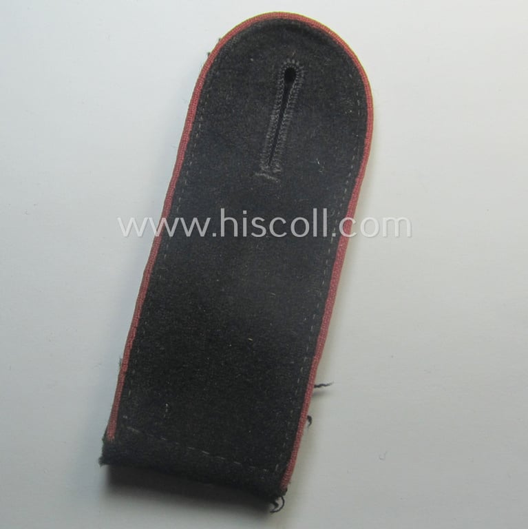 This is a truly attractive - and just moderately worn, albeit regrettably single! - WH (Heeres) and I deem early- (ie. even pre-) war-period, enlisted-mens'-type shoulderstrap (as was specifically intended to be used on the black-coloured, 'wrap-around'-styled 'Panzer'-tunics) shows the neat bright-pink- (ie. 'rosaroter'-) coloured branchcolour and/or typical woolen-type piping attached and was as such worn by a private holding the rank of a: 'Soldat u. Mitglied der Panzer-Truppen' (or: private who served within the tank-troops). The strap is in all facets a fully 'text-book' EM-type strap and does just show the minimal signs of having been used and/or worn as such. The shoulderstrap - that measures approx. 11,5 cms. sized in length as more often encountered - shows some moderate age simply caused by moderate wear and/or usage. The strap comes mounted onto its period tongue and shows a black-coloured underlay (as can be noticed on the pictures). It should be noted that these original, period 'wrap-around'-pattern, EM-type shoulderstraps can nowadays easily be graded 'very scarce': even more so when they are of the EM-type and piped in the not that commonly encountered, bright-pink-coloured- (ie. 'Panzer-Truppen'-related-) branchcolour. I deem that this attractive - and fully textbook! - WH (Heeres), EM-type 'Panzer'-shoulderstrap is with certainty accordingly priced!