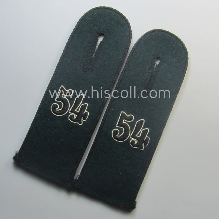 This is an attractive - fully matching and actually scarcely found! - pair of WH (Heeres), early-war-period, 'M36- o. M40'-pattern (rounded-styled- and neatly 'cyphered') enlisted-mens'-type shoulderstraps as was piped in the black- (ie. 'schwarzer'-) coloured branchcolour as was specifically intended for usage by a: 'Soldat des Pionier-Regiments 54' (or: simple private who served within the army-engineers-regiment, numbered: '54') and that comes in overall very nice- (albeit just moderately used- and/or worn-), condition. The neat straps - which are both approximately 11,7 cms. sized in length - have the 'standard-pattern' and/or: dark-green-coloured- and (smooth)woolen-based 'upperdecks' and have the rayon-based), black- (ie. 'schwarzer'-) coloured branchcolour attached. Both straps show the neat, black- (ie. 'schwarzer'-) coloured (and white-rimmed!) neatly hand-embroidered: '5'- and/or: '4'-numerals (as can be noticed on the pictures). The pair never had any tongues attached (it was clearly intended and used as a pair of the 'sew-in'-pattern) and does just show some minimal age-, wear and/or staining (as can be seen on the pictures). The pair in all facets a privately-acquired ie. tailor-made pair. Simply a neat - and I deem quite early- (ie. pre- or early-war-) period - 'Heeres' EM-type, shoulderstrap-pair that belonged to a: 'Soldat des Pionier-Regiments 54': I deem that I have priced this attractive - and with certainty desirable! - pair, accordingly!