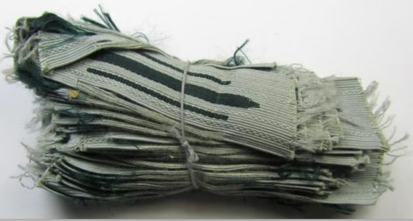 I recently uncovered a period 'bundle' containing twenty, superb and/or fully matching (thus left- and right sided!) and nowadays hard to find, pairs of WH (Heeres) mid- (ie. later-) war-period collar-tabs or: 'Einheitskragenspiegel' being all of the desirable 'generic-type' to be used by all branches of the 'Deutsche Wehrmacht', all twenty pairs coming in an overall very nice- (ie. 'virtually mint- ie. unissued'-) condition. The neat - and/or 'all-linnen'-based - tabs are 'piped' in the darker-green coloured (ie. generic!) branchcolour having a darker-green-coloured centre-stripe and were as such intended for usage by the ('Heeres') soldiers within all branches of the 'Deutsche Wehrmacht'. These collar-tabs were directly applied onto the collar without using a dark-green, woolen-based 'underlay'. As stated above, are all sets fully unconfectioned and/or 'virtually mint' and simply cannot be upgraded (they are just a tiny bit 'wrinkled'): they originate from the left-overs of an old tailor-shop in Germany. My asking-price is naturally per matching set ie. pair. These sets are great to complete any Heeres tunic or to be simply stored in an insignia-collection. It has been some time ago that I did encounter that many pairs of these desirable collar-tabs and I am convinced they will not last long on the web-site: I deem that they are accordingly priced!