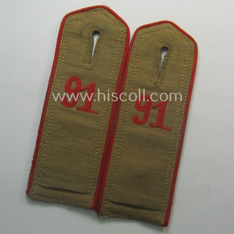 This is a neat - just moderately used but nevertheless not that easily found! - typical early-pattern, so-called: 'HJ'- (ie. 'Hitlerjugend'-) shoulderstraps as was (I deem) intended for usage - and clearly worn! - by a: 'Hitlerjunge' who was attached to the: 'Oberbann 1 - Bann 91' (Bann 91 = 'Bann Oldenburg-Ammerland' situated in the 'Gebiet Nord Nordsee') and that comes in an overall nice- (I deem just moderately used- ie. carefully tunic- or shirt-removed-), condition. The straps - which are executed in typical, beige-tan-coloured linnen as to be expected - have the bright-red-coloured- (and typical rayon-based) piping attached and that show the machine-embroidered - by means of 'Kurbelstickerei' (and/or equally coloured) so-called: '91'-numerals (ie. 'Ziffern'). The straps never had a tongue attached and come as found and/or issued: the boards are of the 'sewn-in'-pattern (and were also used as such). The straps - that are void of an 'RzM'-etiket but that still show some remains - measure 11,7 cms. in length each and do show some minimal age ie. staining simply caused by moderate wear and/or decades of storage. It should be noted that all 'cyphered' (ie. 'Hitlerjugend') shoulderstraps can easily be graded 'scarce' even more so when they are of the desirable early-pattern. Simply an attractive - and actually not that commonly encountered! - so-called: early-pattern, 'Oberbann 1'-shoulderstrap-pair that belonged to the 'HJ-Bann Oldenburg-Ammerland' as was based in the 'Gebiet Nord Nordsee'!