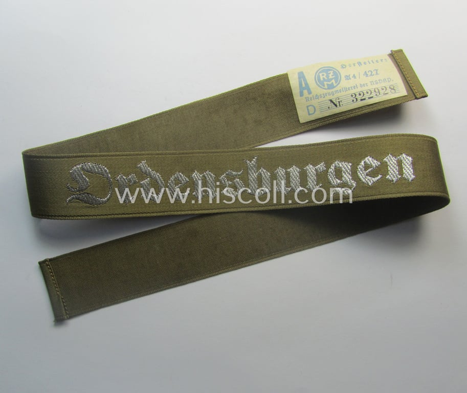 Superb - full length and 'flat-wire'-woven! - 'N.S.D.A.P.'- (ie. 'Politische Leiter'-) related cuff-title (ie. 'Ärmelstreifen') entitled: 'Ordensburgen' (being a 'virtually mint- ie. unissued' example that still retains its 'RzM'-etiket)